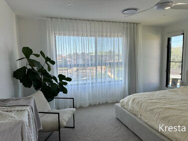 Installed both motorized roller blinds and sheer curtains on one window today. Privacy when you need it, soft light when you want it — best of both worlds.
